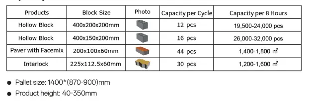 Oprema proizvaja široko paleto izdelkov iz votle opeke, ki pokrivajo več funkcionalnih vrst, kot so navadni bloki, dekorativni bloki in izolacijski bloki. Oblike lukenj vključujejo kvadratne in okrogle luknje, razporeditev pa lahko doseže enovrstne, dvovrstne in večvrstne strukture lukenj. S spreminjanjem kalupa ali prilagoditvijo parametrov opreme je mogoče različne vrste opečnih izdelkov fleksibilno preklapljati, da bi zadovoljili različne zahteve trga.