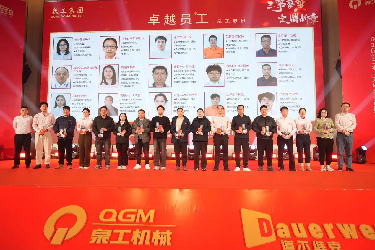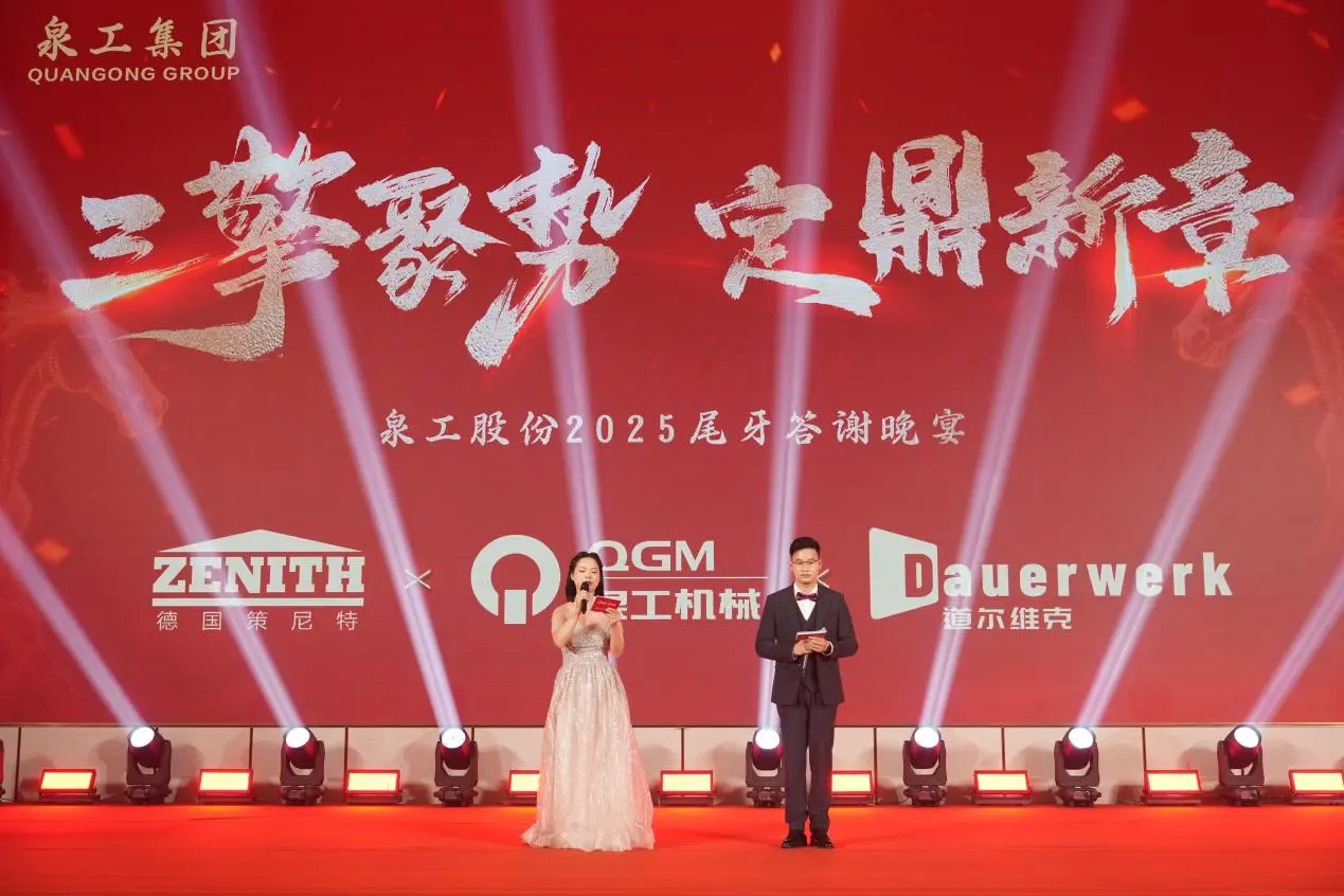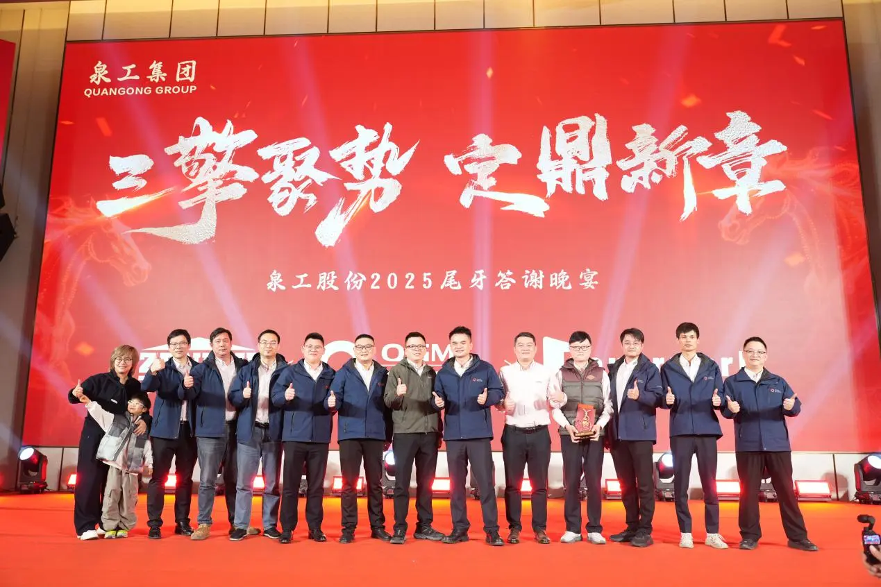 3. februarja popoldneFujian Quangong Machinery Co., Ltd.je v hotelu Quanzhou Donghai Honor organiziral svoj letni povzetek in podelitev nagrad za leto 2025 ter novoletno praznovanje pod temo "Trije motorji se združujejo in postavljajo novo poglavje." Vodje podjetij, ključni predstavniki strank, vsi zaposleni in njihove družine so se zbrali, da bi pregledali prehojeno pot trdega dela, delili razvojne dosežke in se veselili svetle prihodnosti.