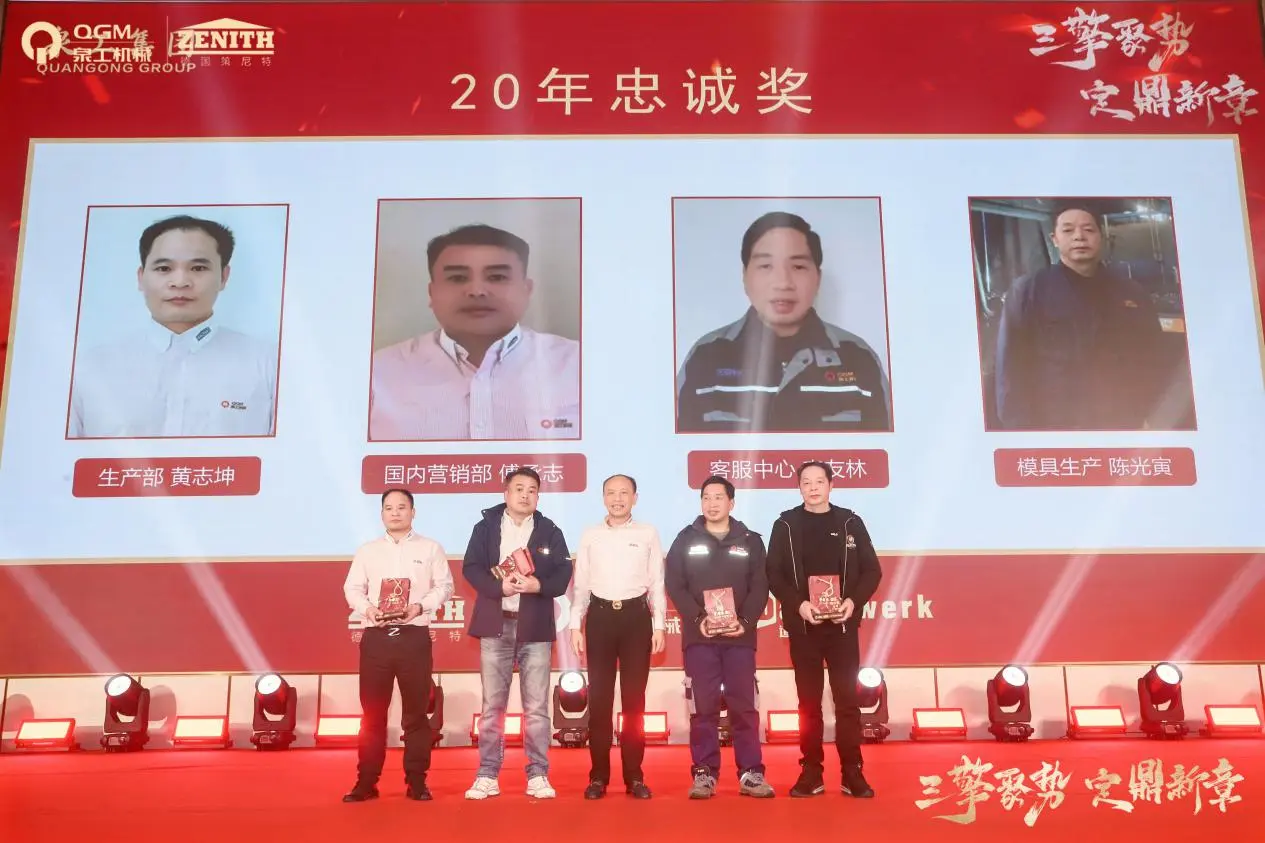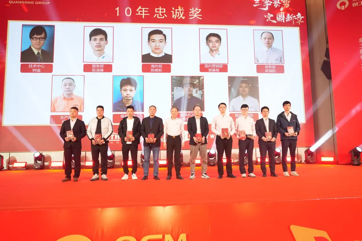 Na letnem srečanju je potekala tudi slavnostna podelitev 10-, 20- in 30-letne nagrade zvestobe. Skupina zaposlenih, ki so hodili z roko v roki s podjetjem in skupaj rasli, je stopila na oder in v celoti prikazala trdne temelje stalnega razvoja Quangong Machinery Co., Ltd. in njegove trajne korporativne kulture.